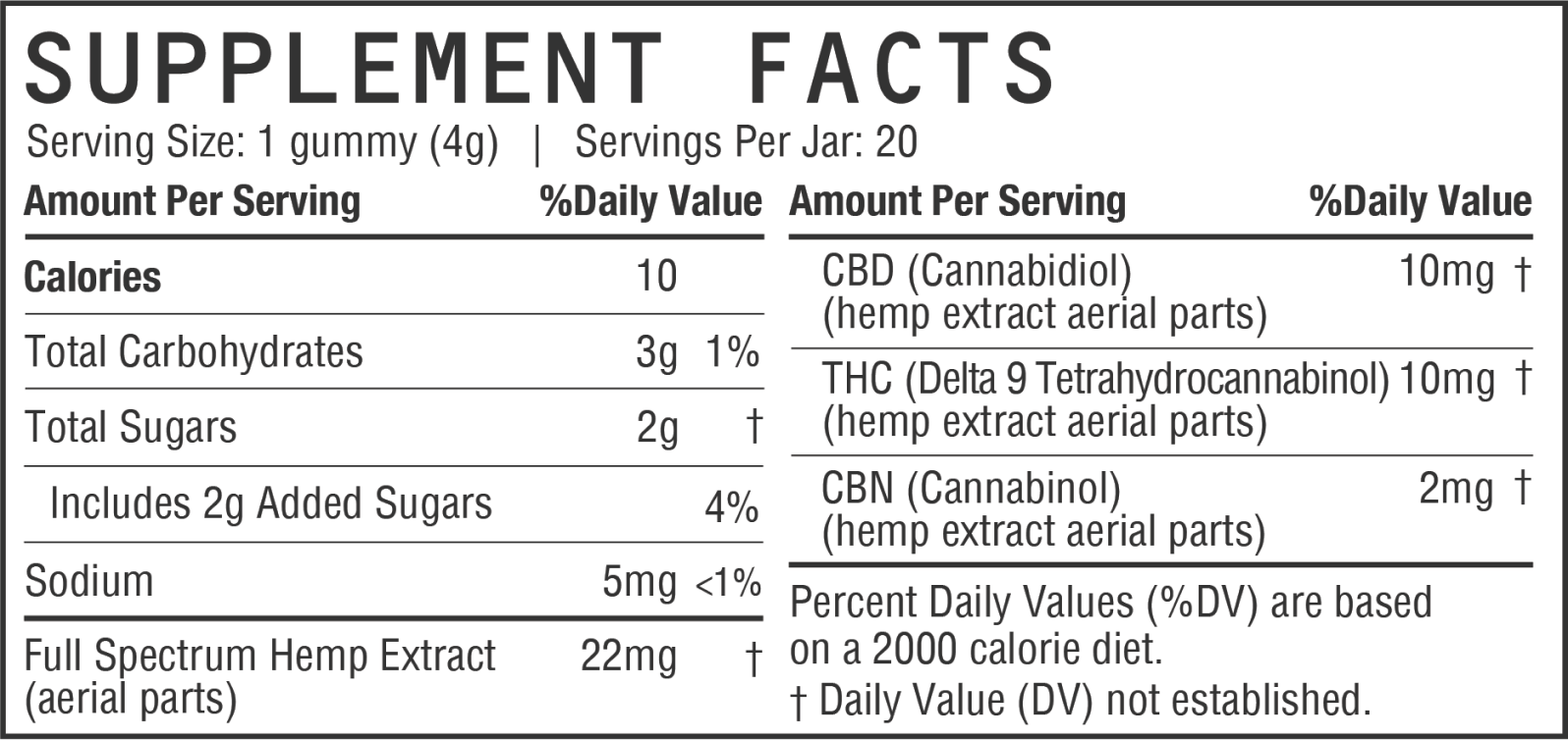 10MG THC | 10MG CBD | 2MG CBN > for that indica-like experience
