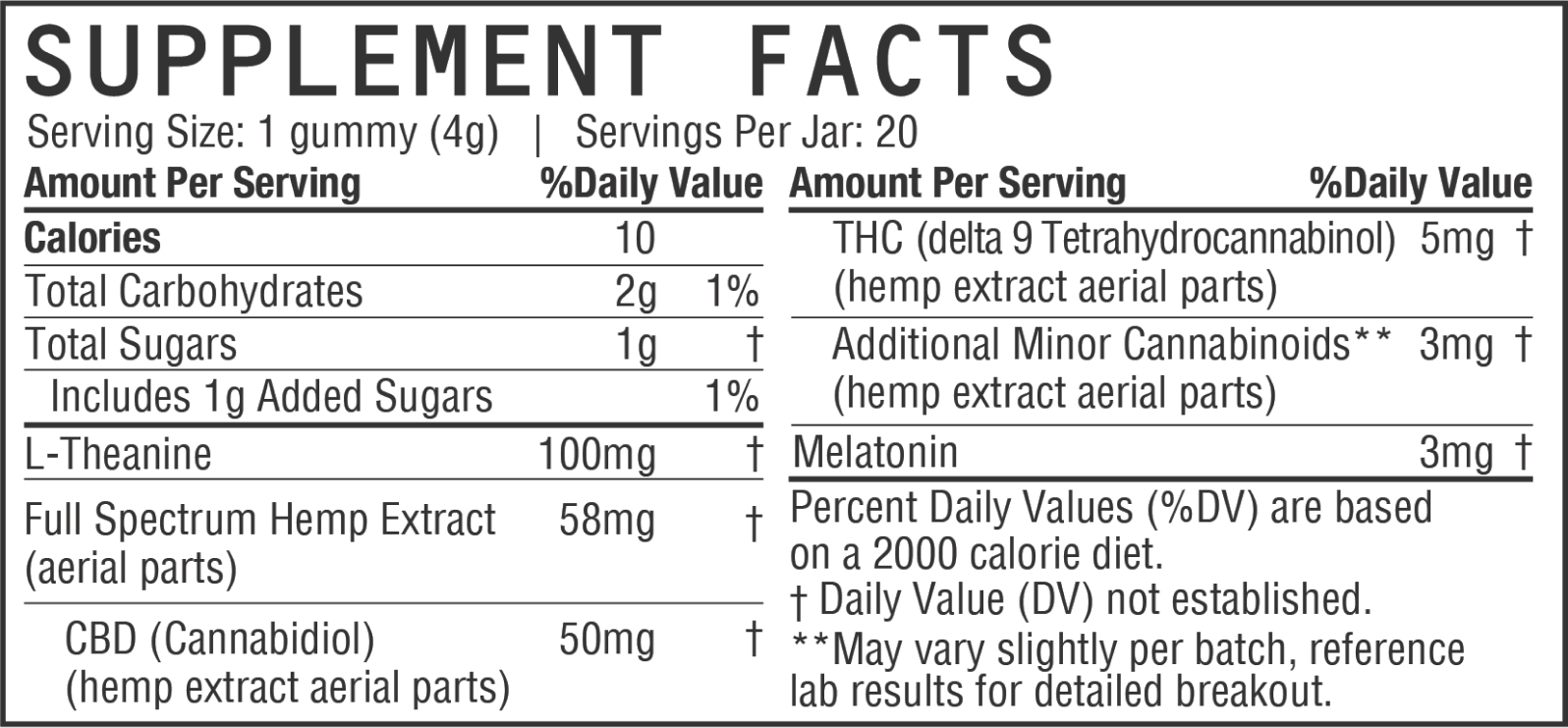 knock out with five gummies, crafted with 5mg delta-9 thc, 3mg melatonin, and other cannabinoids to deliver a fully powered rest. taste the fruity blackberry flavor and elevate your nighttime routine.