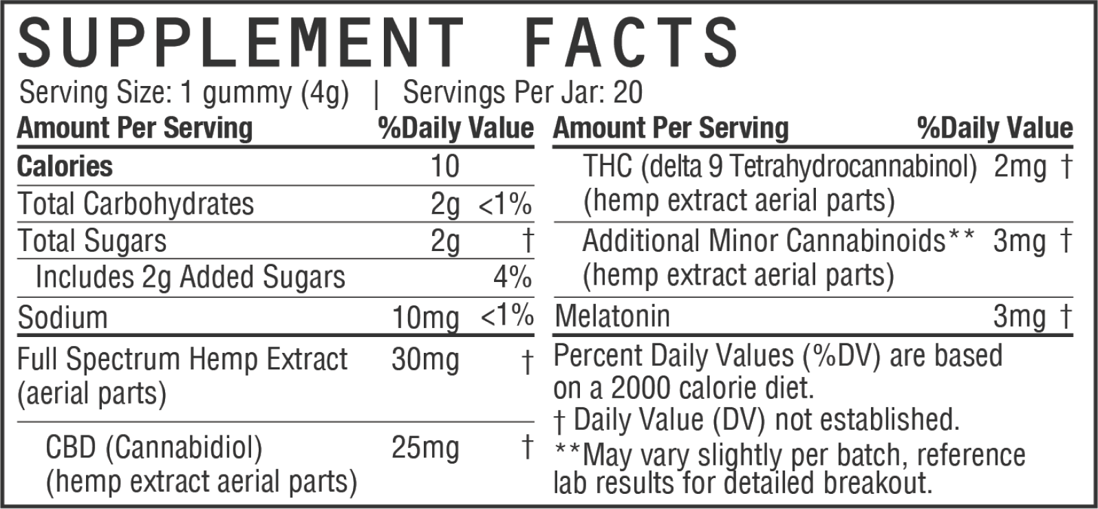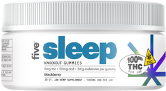 knock out with five gummies, crafted with 5mg delta-9 thc, 3mg melatonin, and other cannabinoids to deliver a fully powered rest. taste the fruity blackberry flavor and elevate your nighttime routine.