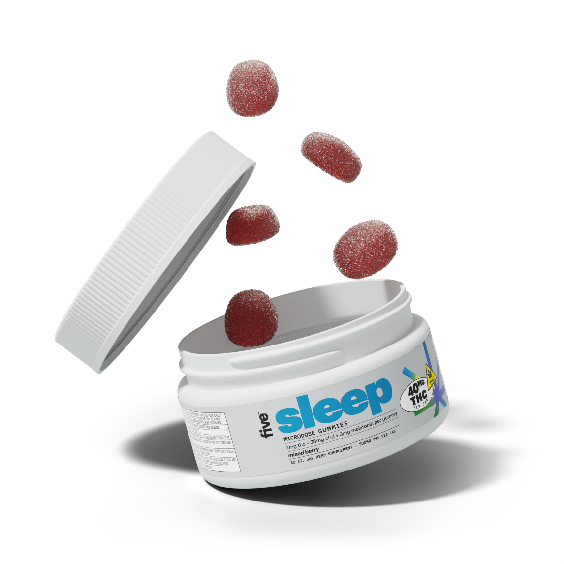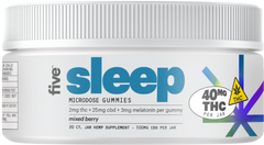 rest easy with five's microdose sleep gummies, crafted with 2mg delta-9 thc, 3mg melatonin, and other cannabinoids to ease you into a sleepy slumber. taste the smooth mixed berry flavor and elevate your nighttime relaxation.